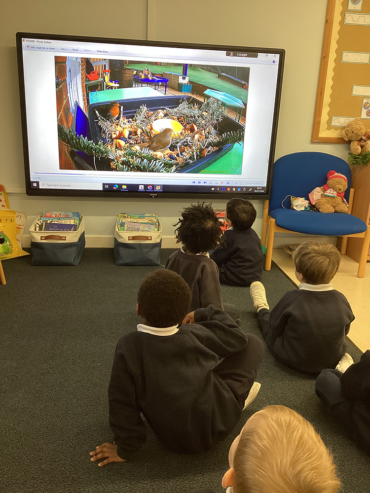 Over the weekend, Nursery also had some very special visitors to our garden. Last Friday afternoon, we worked together with Transition class to create the perfect bird snack tray. We used all of our knowledge from previous learning to think about what the birds might want or need and added sticks, fluff, bread, blueberries, apple, biscuit, birdseed, mealworms and a little bowl of water. We placed it on a table in the garden and set up the camera. The children were so excited to discover we have two, very friendly robins who enjoyed the snacks so much, they now come to visit us when we play outside!