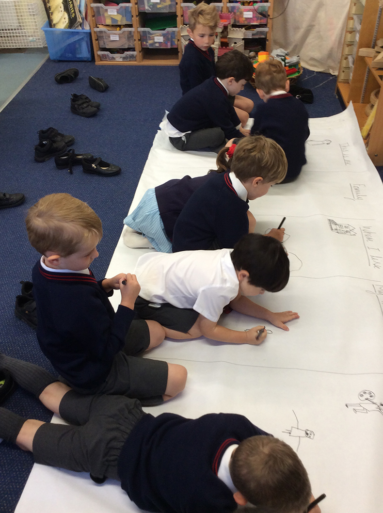 This week we have been following our theme of getting to know each other and celebrating being unique. During our literacy lessons we have been developing the children's confidence to share their thoughts and ideas and listen to one another. We encouraged the children to talk about their families, homes, their friends and the things they love to do. We compared these and noticed if they were different or the same as each other. The children then set about recording this by drawing their ideas using a large piece of paper laid out on the carpet. The children worked all together to represent each of the topics we had spoken about and they loved that they were able to take their shoes off for the activity! Mrs Goodwin and I annotated their drawings with the children's comments, encouraging them to explain further. After we had finished, the children loved looking at their own and each other's drawings.