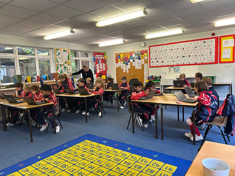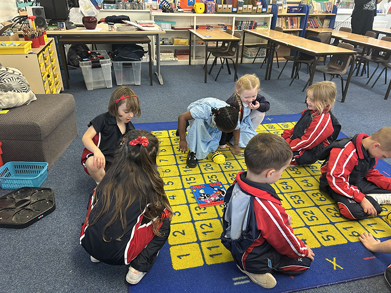 During the computing lesson, the children continued to pretend to be a BeeBot by giving clear instructions. They then programmed the BeeBots using forwards, backwards, right and left to move the Bee Bot around the classroom.