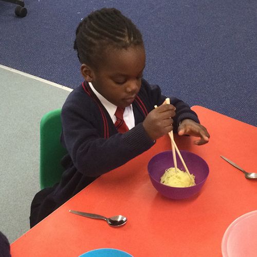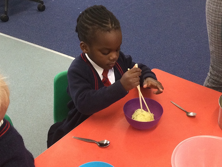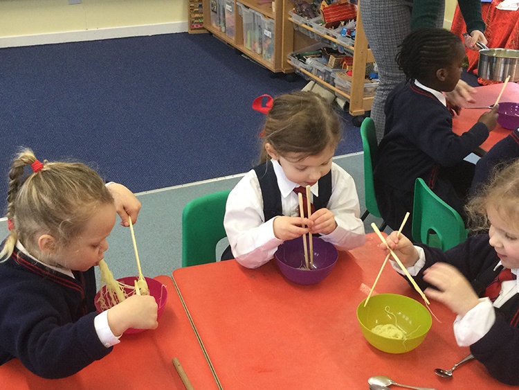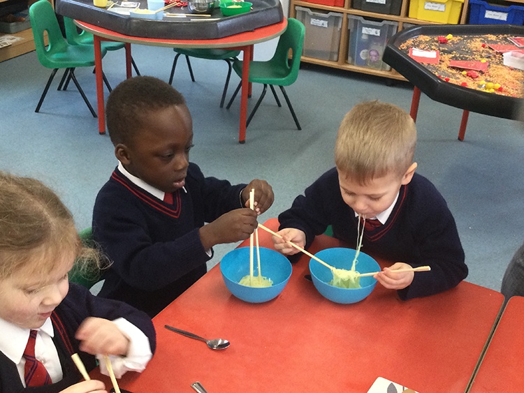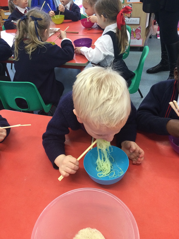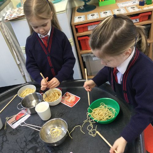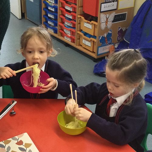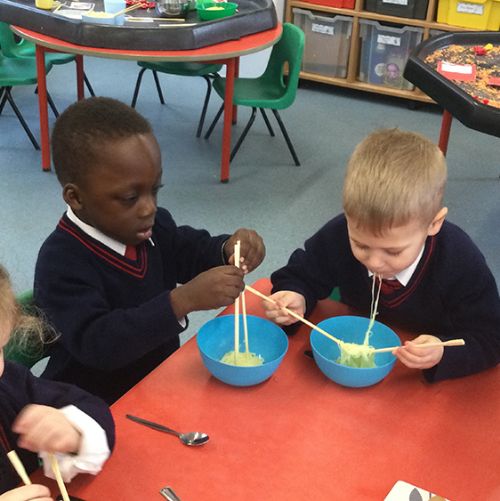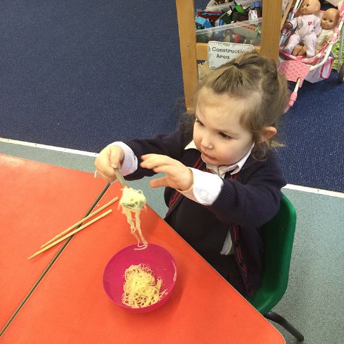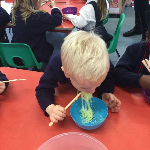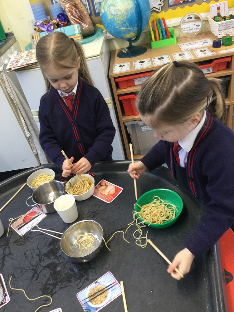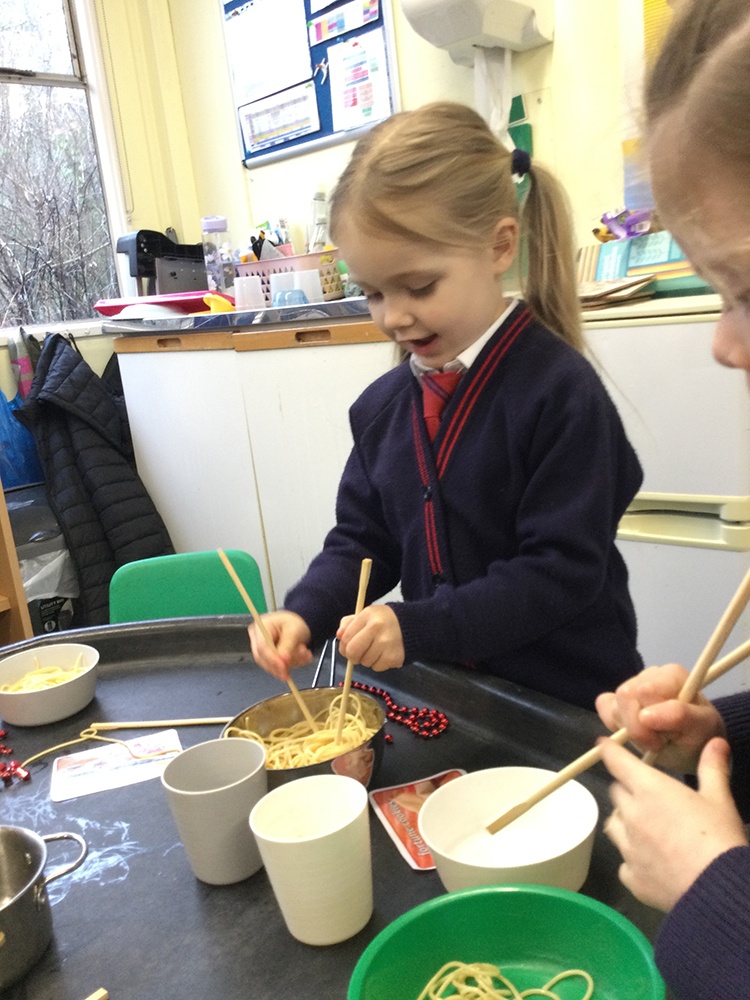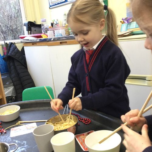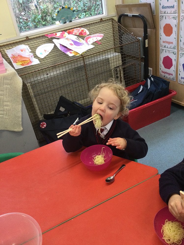 On Thursday, we continued our celebrations with some Chinese-inspired food: a warm bowl of noodle soup! We first followed the instructions to help us cook our noodles and to make our broth. Then we explored our senses as we each tried a small bowl of noodles using some chopsticks! These were a bit tricky to use, but the children showed great perseverance and fine motor skills. To get a bit more practice, the children took turns eating in our Chinese restaurant where they each used their chopsticks to serve up noodles to each of the restaurant's guests.
