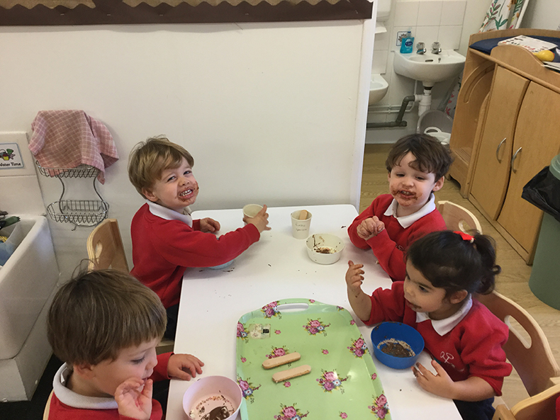 This week’s cooking activities consisted of firework biscuits, sparklers, pizza and banana cake. It is so important for children to love and enjoy what they do. Therefore, we all got very messy and sticky whilst dipping our sparklers into melted chocolate, sprinkles and marshmallows. In true Robins style, we also had a cheeky taste as you can see by their faces!