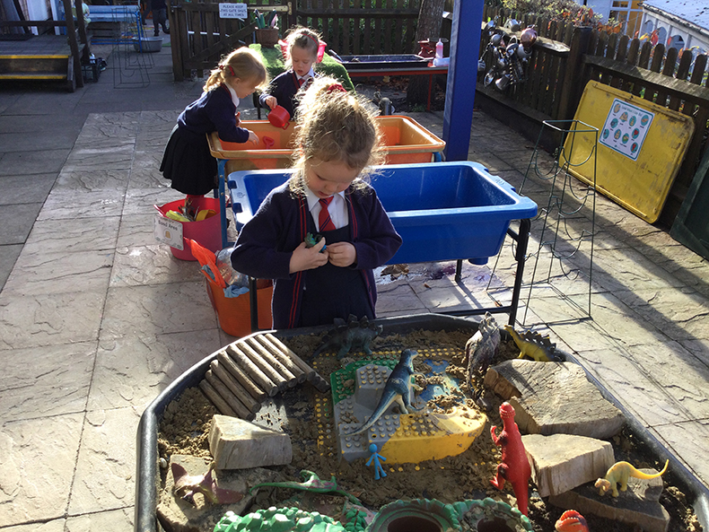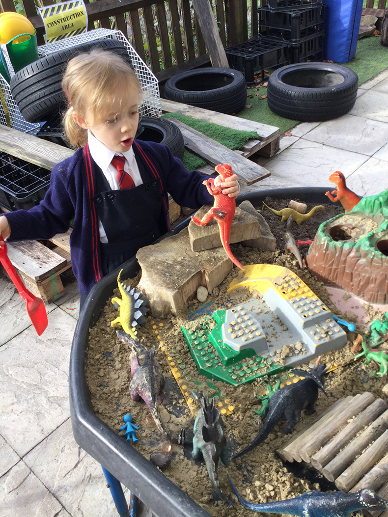 We have enjoyed lots of dinosaur-themed play this week. The children helped me to create our very own dinosaur world in the small world area. We had to mix green paint, cornflour, sand and soil to create the right terrain for our dinosaurs. We also added lots of trees, a cave, a volcano, and of course, the dinosaurs! The children loved stomping their dinosaurs around, creating their own imaginative stories. This week, we have also made our own dinosaurs using junk modelling, rescued the dinosaurs trapped in the icebergs and created dinosaur footprints in the playdough. We also used our magnifying glasses to explore some dinosaur fossils we found in the sand tray.