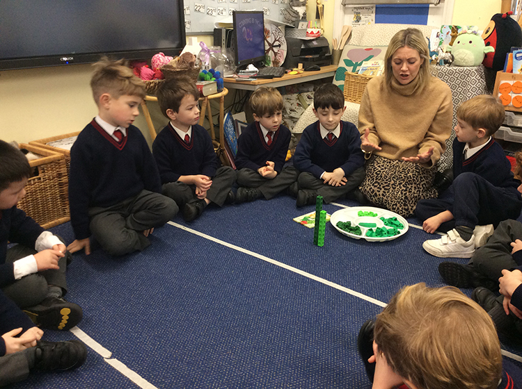 We introduced the vocabulary of taller, shorter, shorter than or taller than or equal/the same. We linked the concept of height to the story of Jack and the Beanstalk, and the children knew that the beanstalk was so tall it went up through the clouds! We ordered different beanstalks made of cubes and discussed their height in comparison to one another. We then counted how many cubes tall each beanstalk was. We then used cubes to measure some wooden blocks and record how many cubes tall each one was. In small groups, the children then measure other items using cubes and record this in their maths books. Measuring the small world castle was a great challenge!