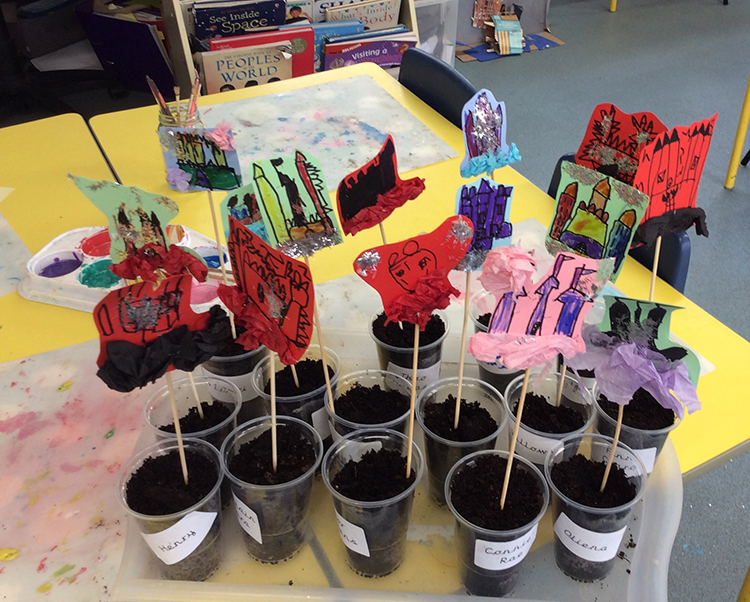 their own fairytale castles made from card and secured these to kebab sticks for their bean to climb towards. The children were interested to watch a time lapse video of a plant growing to see clearly the stages of this process. We will be looking after our beans as the weeks go on and watching carefully for any changes. The specific type of runner beans the children planted are called Black Night, which we thought linked well to our topic. If they manage to produce pods, these pods will be black with purple beans!