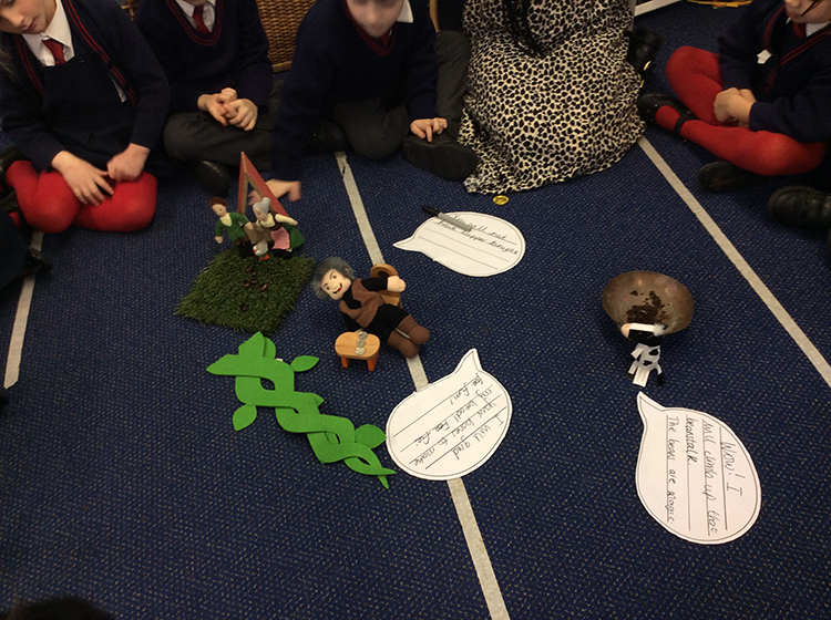 We retold Jack and the Beanstalk using props and then wrote speech bubbles for the various characters as we went. The children were really great at not only remembering the speech within the story, such as Fee, fie, foe, fum! but also making suggestions about other things the character might say. Then in smaller groups, the children wrote their own speech bubbles and drew a character to accompany it.