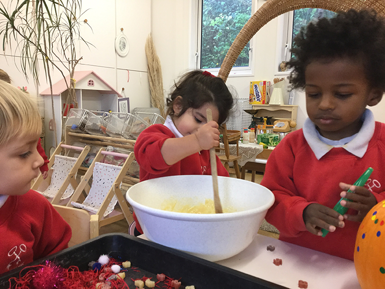 This week’s activities followed a sensory theme which provided the children with lots of exciting opportunities to explore a variety of activities that promoted rich communication and language. One tray consisted of spooky pasta and lots of fun was had exploring the different Halloween-themed shapes. As an extension activity, the children used tweezers to collect and sort pasta shapes into a variety of boxes. The other sensory tray consisted of shredded paper, pom-poms and shakers.