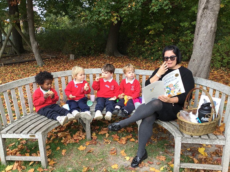 Connecting with the natural world is one of our favourite activities and on our adventures this week, we observed many autumnal changes which connected to Leafman. The children chose one of their favourite leaves on our walk and took it home. Using our senses, we spotted some lovely flowers so we stopped to have a quick sniff. Funnybones also joined us for a visit to see the sheep. Funnybones certainly enjoyed spending time with us all and he liked our many activities. His favourite activity was a hot chocolate treat on the semi-circle bench.