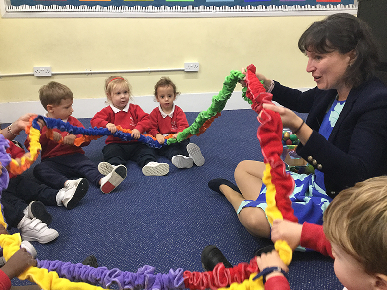 Lots of fun was had in music when we sat in a circle and used a huge scrunchie. The children’s favourite thing was when we let go of the scrunchie when the music stopped.