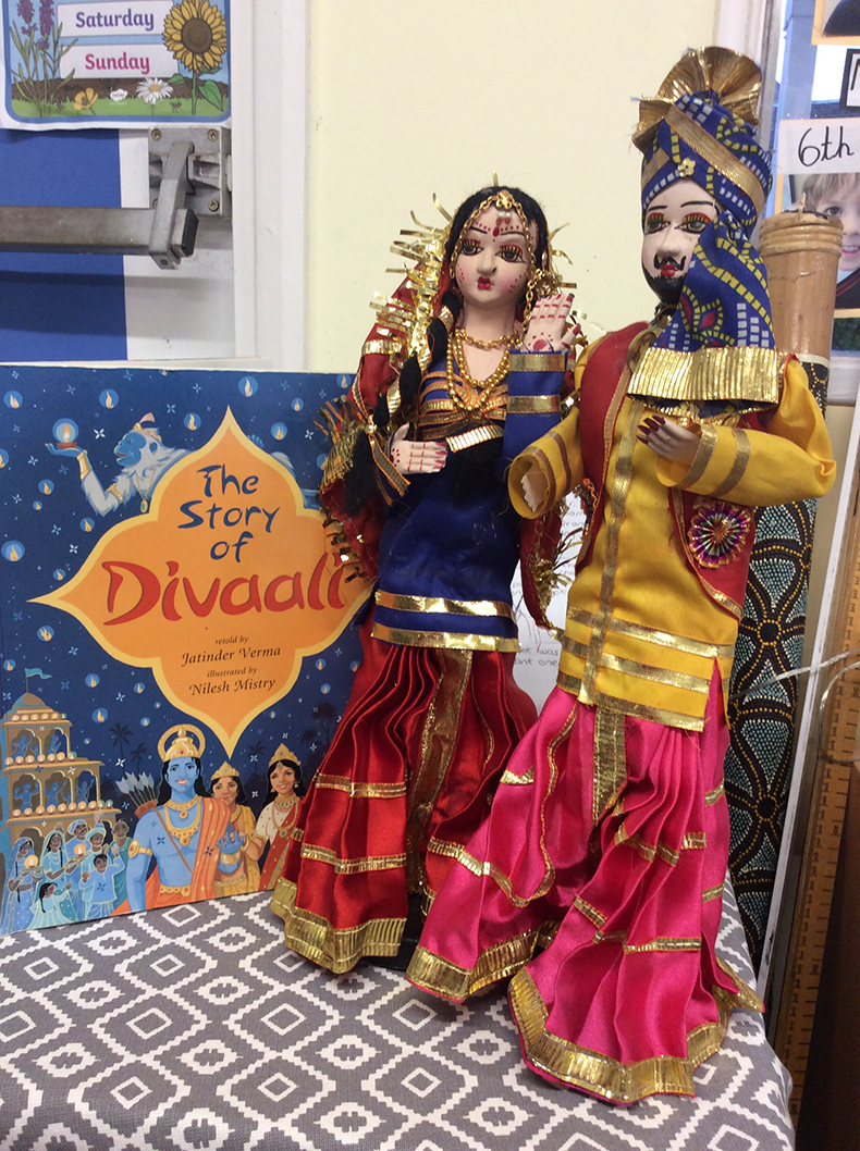 We have also learnt about all the various ways Diwali is celebrated around the world and the traditions that people follow. The children discovered that fireworks and lights play an important part of Diwali and watched a clip following a little girl celebrating with her family. We had fun making rangoli patterns on the floor using chalk and made a large whole class rangoli pattern using coloured sad, lentils and gems. Some children enjoyed drawing mehndi designs on card hands and writing Diwali cards. All the children have loved playing in the roleplay house that is decorated for Diwali with fairy lights and photographs. The children gave the house a good clean as this is traditional to do during Diwali and pretended to prepare delicious meals.