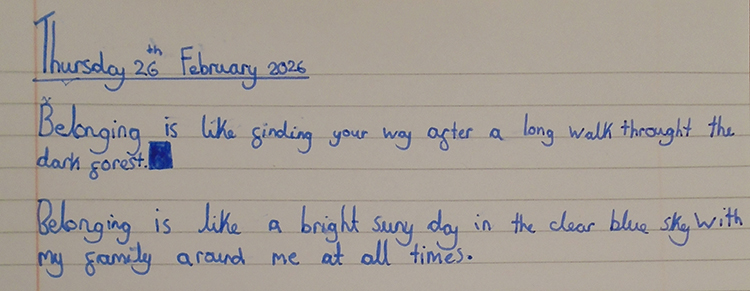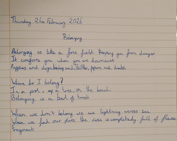They were asked: What does it mean? How can we belong? Where does Ahmet belong? Can you belong in more than one place/to more than one group? The children added their ideas to a writing frame and they then used these ideas to write a poem about belonging, using a variety of writing techniques.