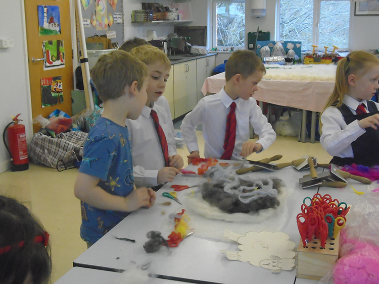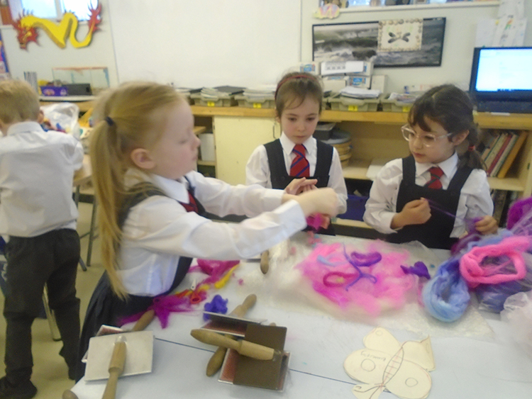 During the art workshop, the children created a spring felt picture which will then create a whole school felt banner. They loved the process of carding to separate the wool fibres, which they turned into spring images of sheep, rabbits and a range of spring flowers.