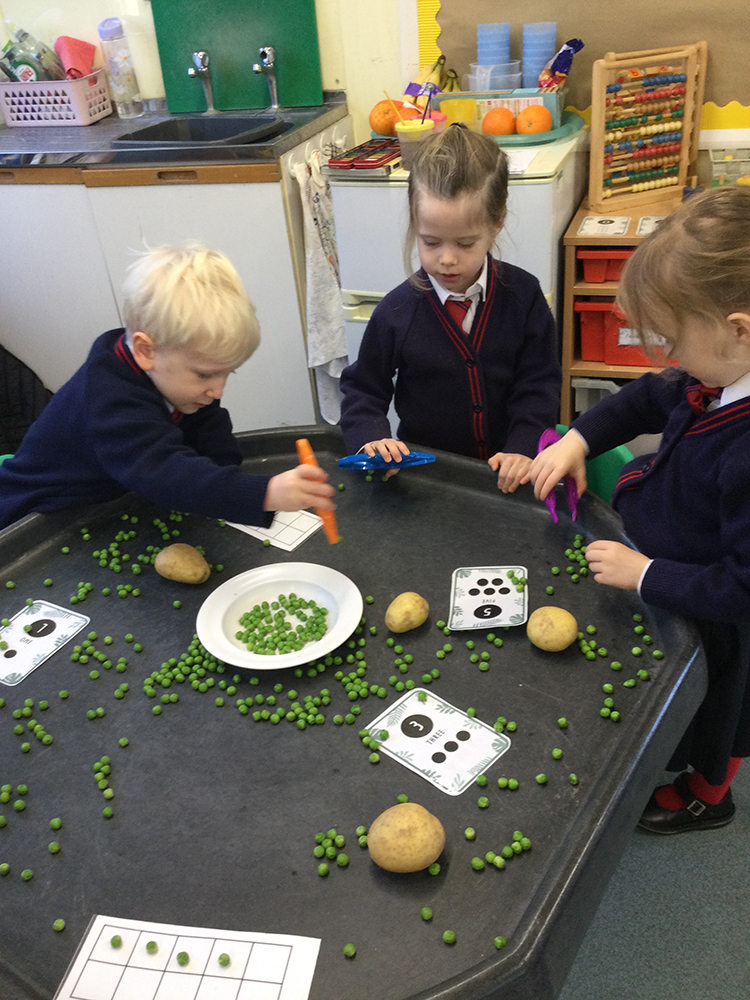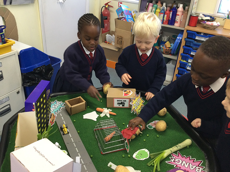 During literacy, we read Supertato! which the children were very excited about. They were fantastic at predicting what was going to happen next and they thought up lots of different ways that we could rescue Supertato from the freezer after Evil Pea pushed him inside. During their play, the children loved re-enacting the story in the small world area, rescuing the vegetables and trapping all the Evil Peas in jail.