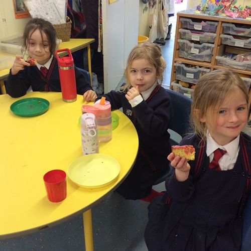 As a group, we applied this new skill to weigh out ingredients to make a cake. By placing 2 eggs in one side of the scales, we then added flour to the other side until it balanced. Then we did the same to weigh out the sugar and finally the butter. We added the eggs at the end and everyone had a turn mixing the ingredients together. To celebrate the Year of the Horse, we made our cake in the shape of a horse and her foal. We added red and yellow icing and enjoyed eating our cake at snack time with our milk.