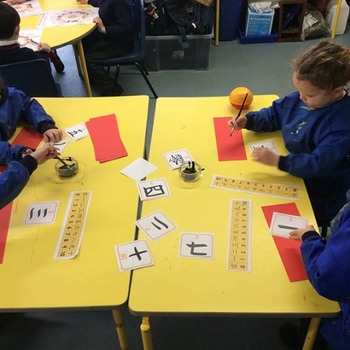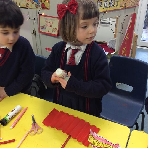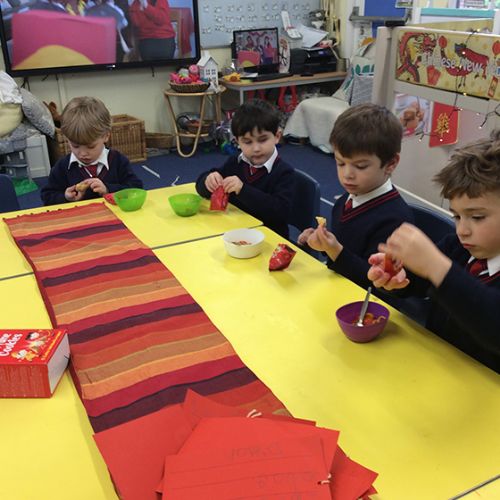 The children have also loved making paper dragon puppets and lanterns this week, listening carefully to the steps needed to make these. Form 1 have also enjoyed learning how to represent numbers 0-10 using Chinese characters. After watching a video of a group of children in Shanghai taking part in a calligraphy lesson, we decided to try this using paintbrushes and black paint on red paper. It was tricky but also fun!