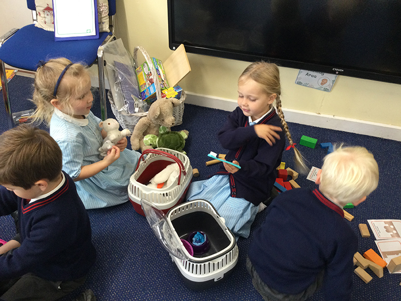 We have been on a visit to the vets in the home corner this week, and the children have loved looking after the animals. We practised our mark making as we wrote doctors' notes for the sick animals, and took turns pretending to be the vet. We made a new bed for our dogs using junk-modelling, and some of the children had a fantastic time decorating it with the paints. The children also created superb paper plate pets, painting their own pet or a pet they would love to have. The children thought carefully about the features their pet would need, using some photographs as clues. We had some great dogs, cats and fish, all of which are now hung proudly on the wall. We loved looking through the book You Choose, choosing our favourite pets, discussing why we would like them and what different things we would need to do to look after each animal.