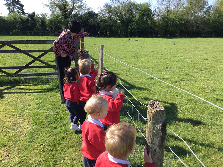 Shadows have been of interest and to extend their interest further, we visited the playground to wave to our shadows and afterwards, we climbed over the wall to visit the sheep. Climbing is a great skill and especially in a variety of ways. I demonstrated how to successfully climb over the low-level wall and the children followed my instructions. Once on the field, we visited the geese and lambs. There were two friendly and very inquisitive little lambs. They came running over to us and let us stroke them. This was such a lovely experience and we were very lucky to have such a close encounter with
