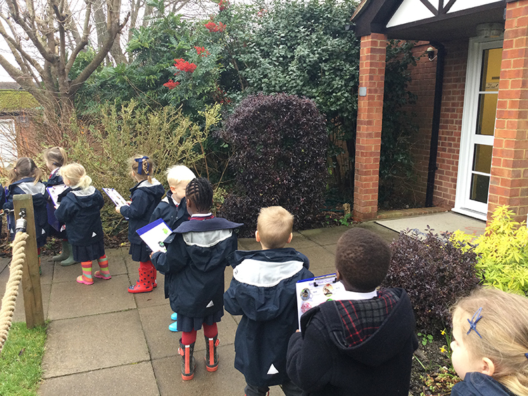 We put on our welly boots, gathered our clipboards and headed out for a walk around the school grounds. The children listened carefully to the beautiful bird songs and spotted lots of exciting signs of spring, including new flowers, seedlings just starting to sprout and lots of green and red buds on the trees. They were intrigued by these, so we explored how buds turn into new leaves and flowers by looking at lots of different photographs.