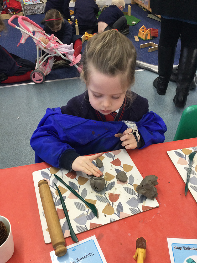 They each then had a go at designing some fantastic shape pictures including a rainbow, the Queen and a monster. We practised our drawing skills in Literacy this week as we followed the instructions to draw a baby chick. We had to watch and listen carefully to help us find out which shapes to use and the children worked really hard on their drawings, taking their time and showing great concentration. We continued exploring chicks as we developed our fine motor skills using the clay. The children enjoyed exploring the texture of the clay and experimenting with different tools and methods to attach the clay together. We worked out that a little bit of water can be very helpful when adding two pieces of clay together and the children came up with some fantastic spring creations.