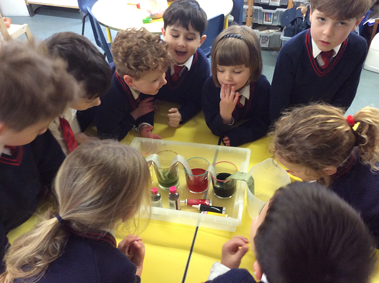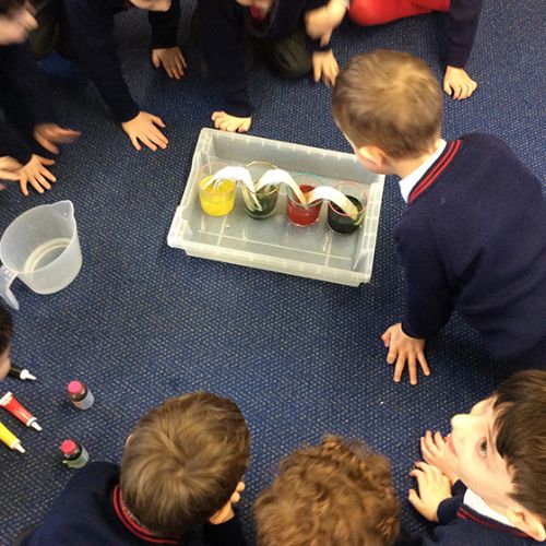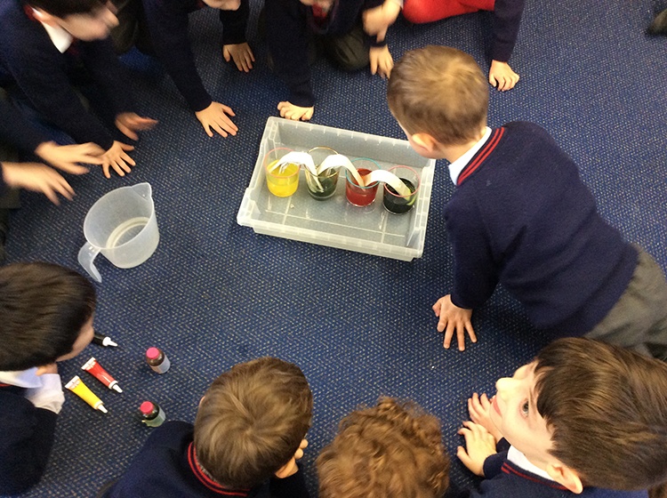 We enjoyed trying the walking water science experiment this week to learn more about how plants transport water through their roots and stems. The walking water experiment demonstrates capillary action, which is the same process plants use to move water from their roots to their leaves. In this experiment, coloured water travels up against gravity through the fibre gaps in a paper towel, acting as a model for how water moves through the vascular tissues in plant stems. The children predicted that the water would be absorbed by the towels and over the next few days the coloured water started to become more evident.