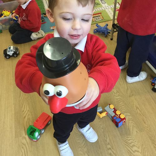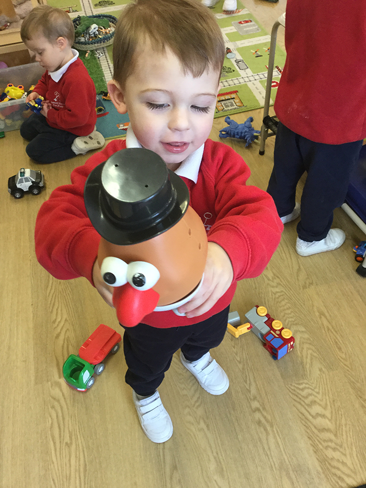 As part of this week’s topic, the children enjoyed exploring a variety of activities. There was a mystery on Thursday as something green, round and looking for trouble had taped vegetables to the floor in the garden! Once inside, we listened to a recording on our talking tin and guess what…it was the Evil Pea! This really excited the children and they were super excited to find out more. The Robins loved listening to Supertato and to continue and extend their learning, they made their own potato people. They were able to share the resources and place the features in the correct areas.