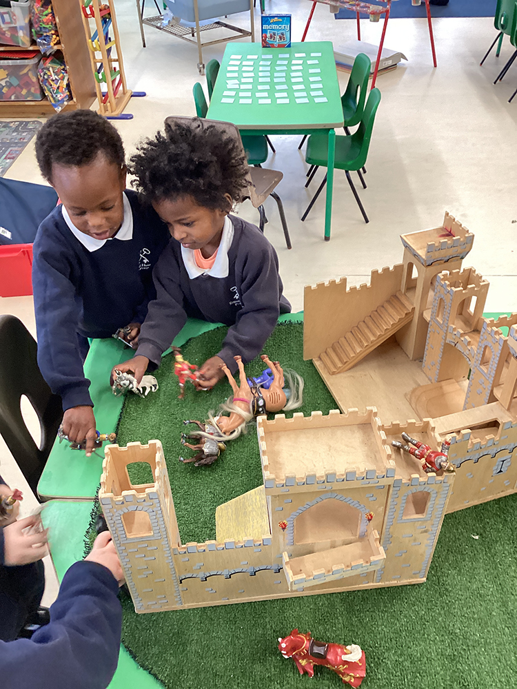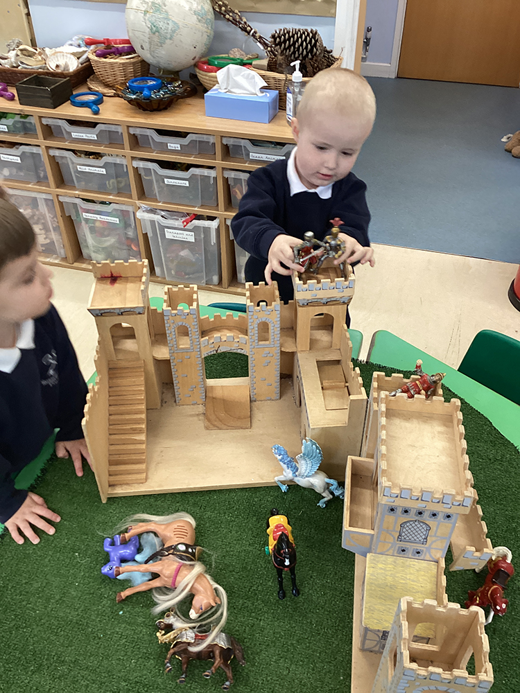 After watching the Form 4 rehearsal of their play 1066, the children were very interested in kings, knights and castles. They have used the small world set up to role-play parts of the play, even remembering some of the kings' names.
