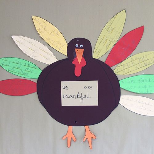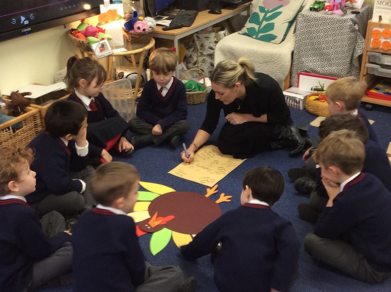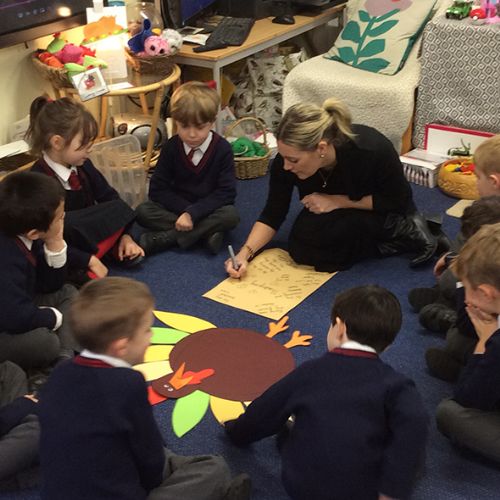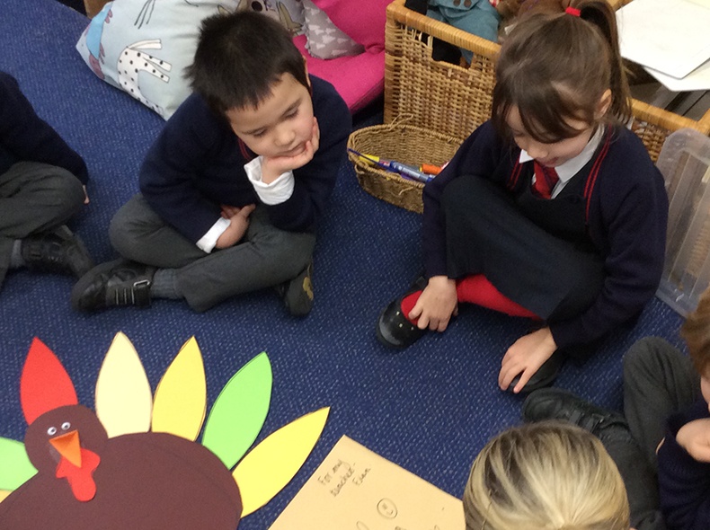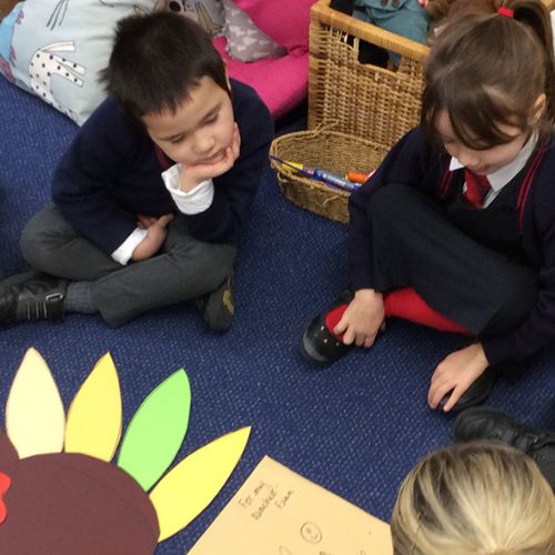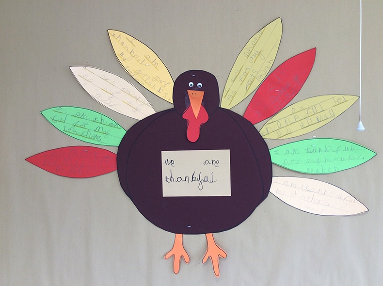 We focused on the meaning behind Thanksgiving and that it is a time of year that people reflect on all the things they are thankful for. The children thought of the things in their life that they are grateful for such as their families, friends, teachers, pets, their homes and their toys. Each child wrote what they were thankful for on a piece of card shaped like a feather. We then put their feathers together to create a Form 1 thankfulness turkey! We displayed this in the cloakroom with all the lovely things the children had said in speech bubbles.